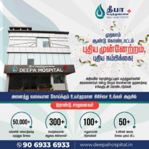 Address:Deepa Hospital, 6, Tiruverkadu Rd, TNHB Colony, Ayappakkam, Chennai, Tamil Nadu 600077, IndiaIndia